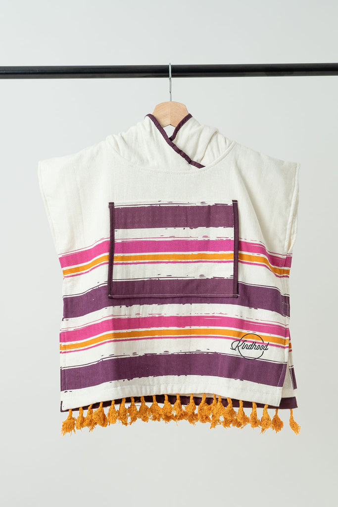 Acacia features pink, purple, and gold striping and gold tassels running along the hem of the poncho. Inspired by the fall colors of sunsets, trees, and oceans across the US, this towel inspires us to get outside, enjoy the crisp autumn air, and bundle to be able to play, run, cozy, or rest.